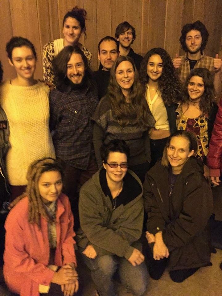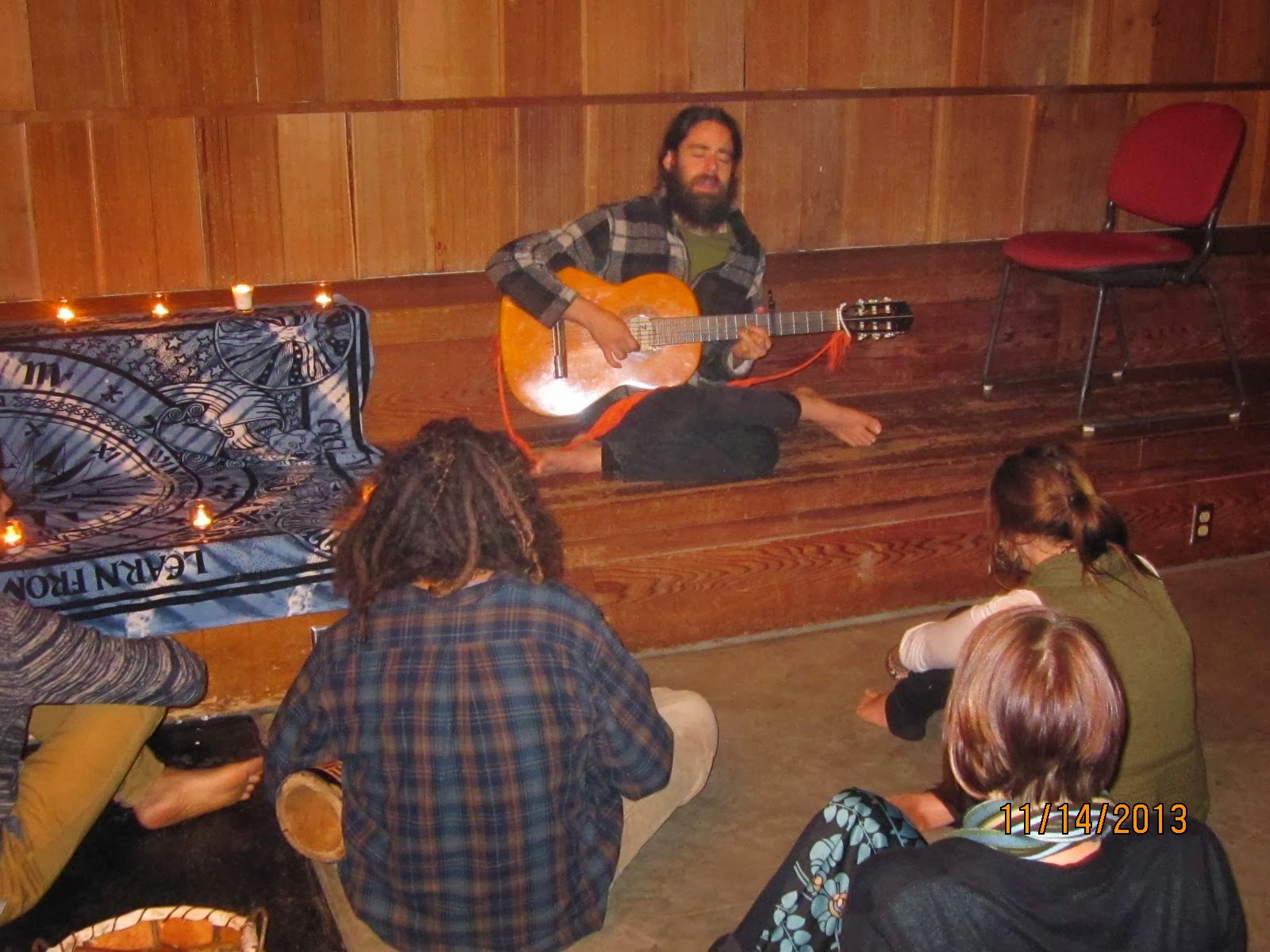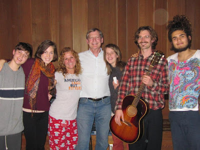 On November 6 we welcomed Gaia Energy Healer and musician Michael Mercker back to Common Bread. He led us in chants, grounding exercises, and chakra cleansing movement-meditation. After potluck, 35 people stayed for Mike's energy playshop under the full moon. Below, our student leaders Philip and Natalie at left. Above them, left, is Mike, and Common Bread chaplain Fred to his right.