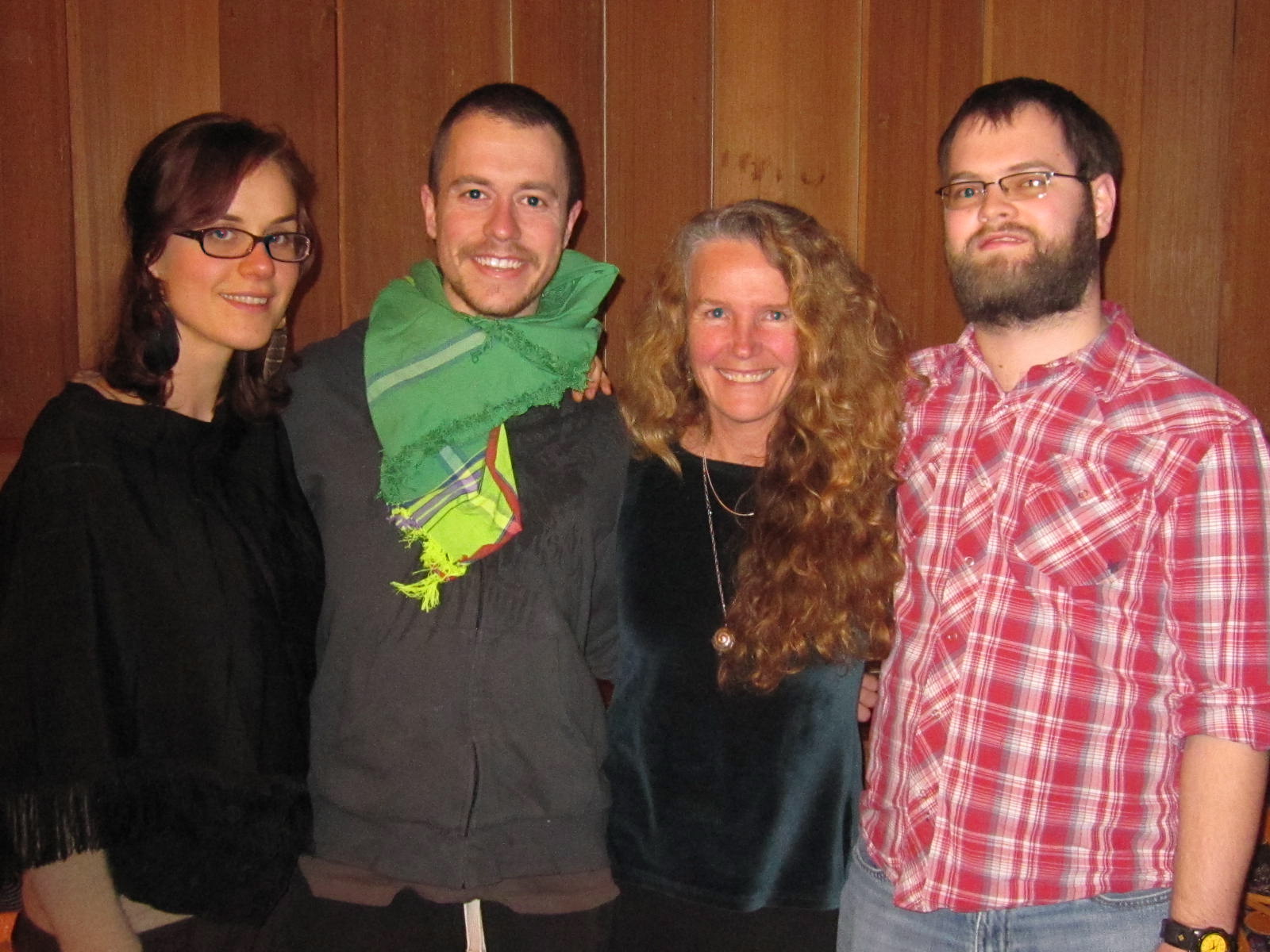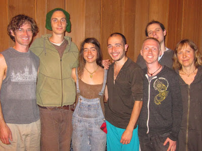 Greener & wisewoman Chelan Weiler (2nd from left below) gave a profound talk & experience of 'Inner Spirit Hypnotherapy' after potluck. Mike Mercker (with guitar) provided music.