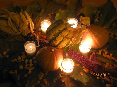 Below, our Samhain alter, where we offered our losses, griefs, and honored the ancestors. Samhain is both sad joyful, letting go of the old to make space for the new.
